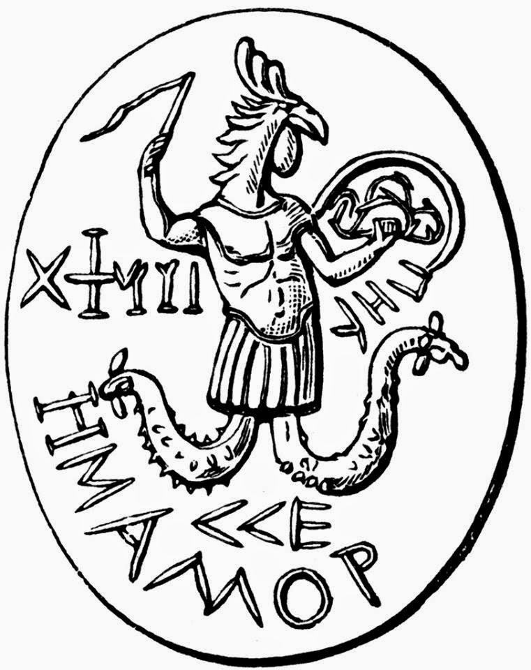 Jaldabaoth con una vara en la mano, en la que florece una ROSA, atributo el cual, al aproximarse a los hombres, los